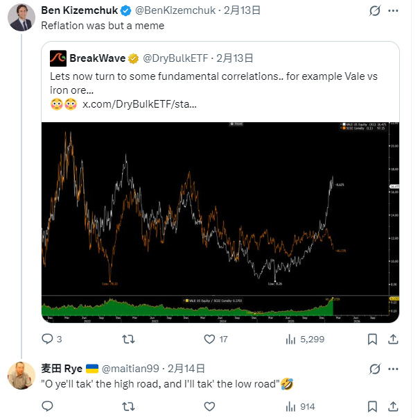 我非常强烈的认为,“周期股上行”的趋势很快会逆转。所以我前几天做空 XLE 0.00%↑ 遇到反弹暂时平仓了。但我肯定近期还会做空石油版块——等伊朗形势更清晰一点再说。但不做空石油股,又要代表我分析认为“周期股下行”,左侧建仓的话,我认为有一个好标的, VALE 0.00%↑ 。原因看这图,以及我的调侃:
